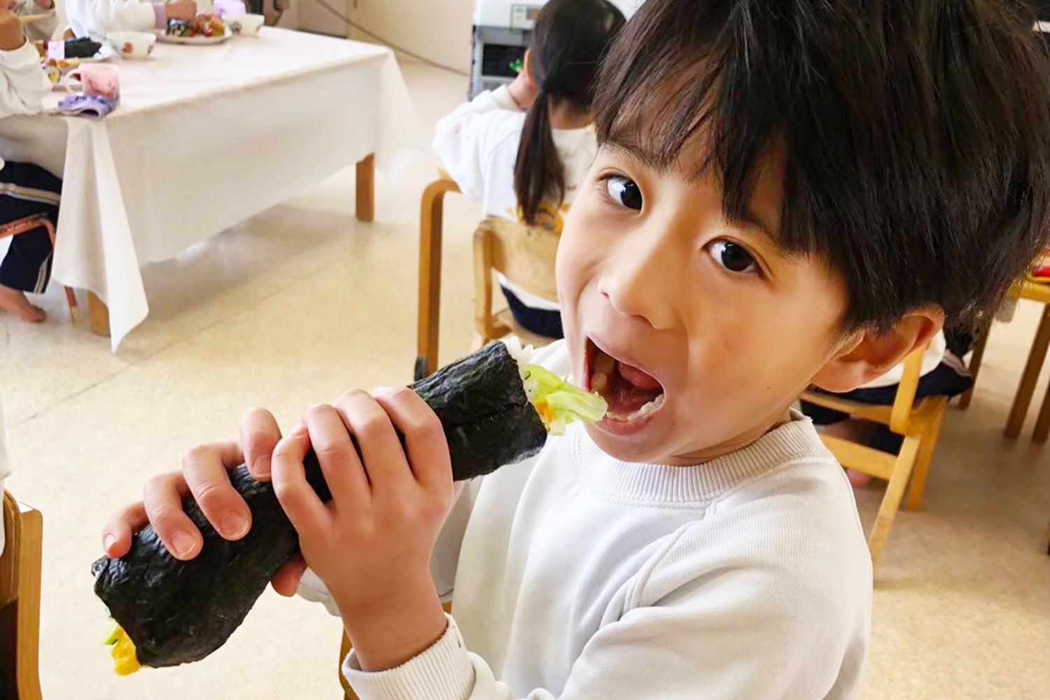 自分たちで作った海苔を使って、恵方巻きをつくって食べる体験も行っています。